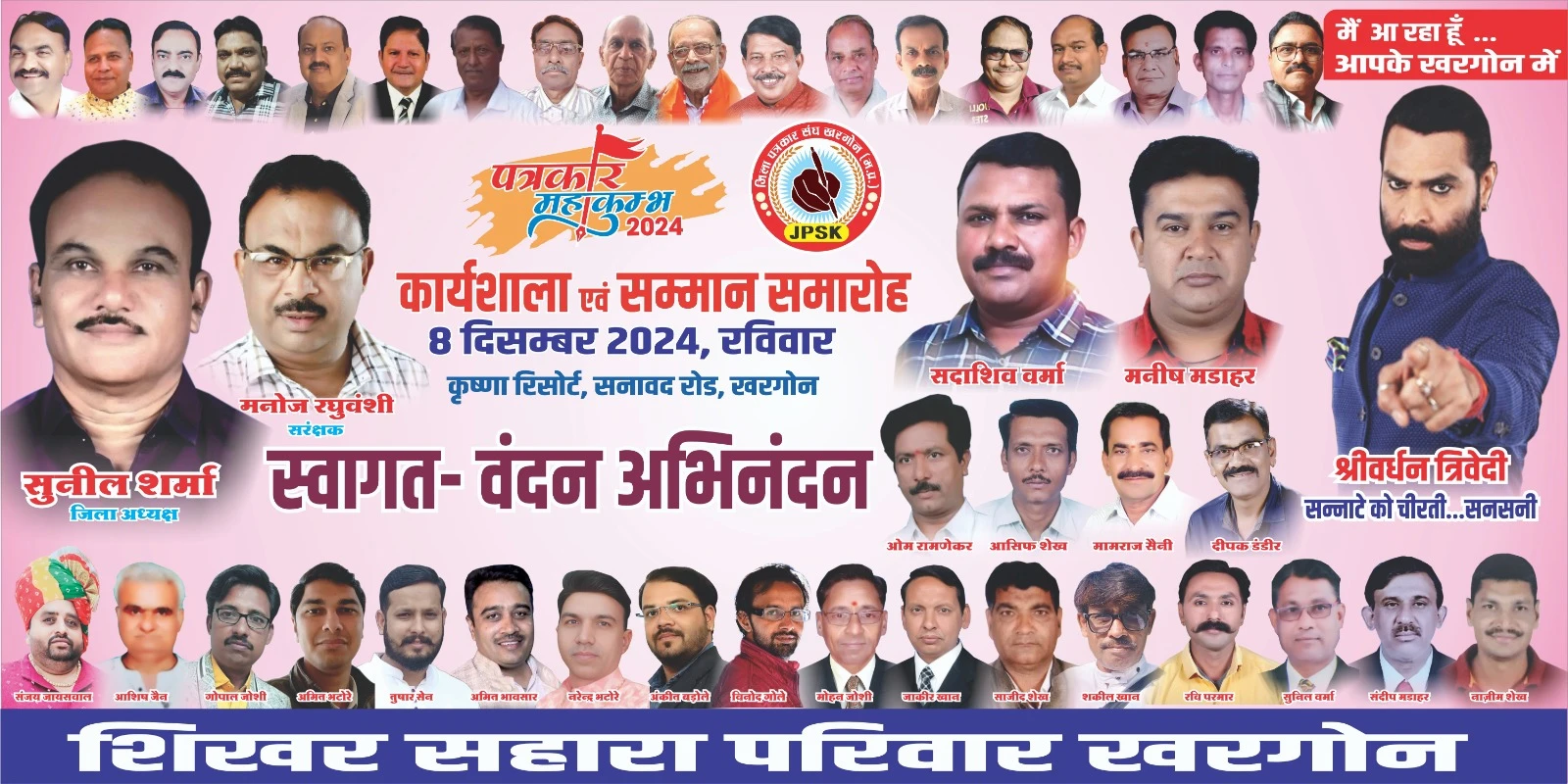खरगोन : रविवार 8 दिसंबर को जिला पत्रकार संघ खरगोन द्वारा भव्य पत्रकार सम्मेलन का आयोजन कृष्णा रिसोर्ट मैरिज गार्डन सनावद रोड पर किया जाएगा। उक्त कार्यक्रम जिले के समस्त पत्रकार साथियों को समर्पित होगा और इसमें कई महत्वपूर्ण सत्र आयोजित किए जाएंगे। जिला पत्रकार संघ के अध्यक्ष सुनील शर्मा एवं संरक्षक मनोज रघुवंशी ने बताया कि प्रथम सत्र में प्रातः 10 बजे से दोपहर 1 बजे तक पत्रकार कार्यशाला का आयोजन किया जाएगा। जिसमें मुख्य अतिथि सनसनी के लोकप्रिय एंकर श्रीवर्धन त्रिवेदी, विशेष अतिथि वरिष्ठ पत्रकार प्रकाश हिंदुस्तानी, इंदौर, डॉ. एलएन मालवीया भोपाल, वरिष्ठ पत्रकार भुवनेश सेंगर अपने अनुभव और विचार साझा करेंगे। द्वितीय सत्र में दोपहर 2 बजे से 4 बजे तक वरिष्ठ पत्रकारों का