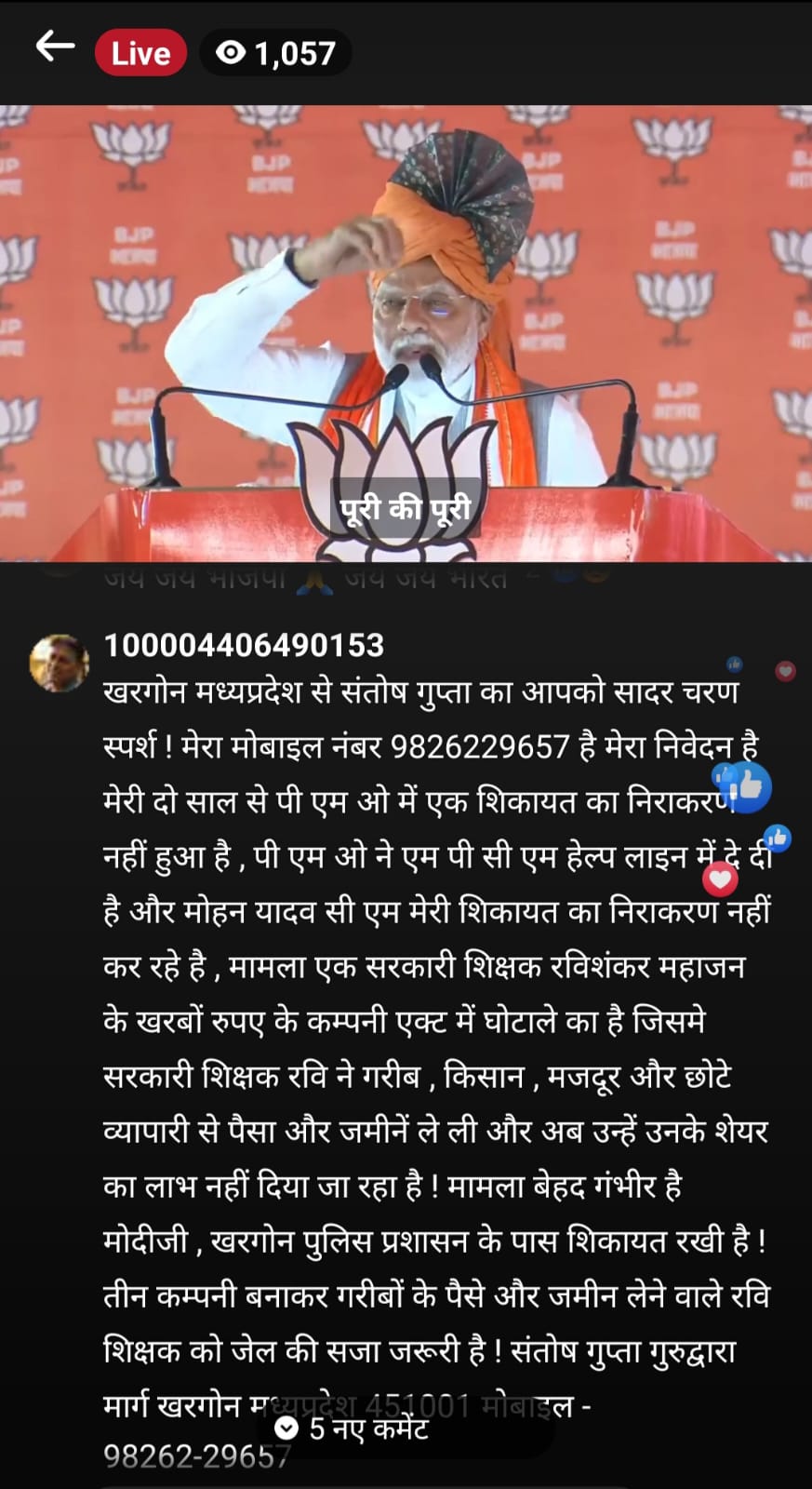 खरगोन - *मोदीजी को अनेक लाइव कमेंट्स के बाद भी खरगोन एम पी के सरकारी शिक्षक रविशंकर महाजन पर कोई कार्यवाही नही !*